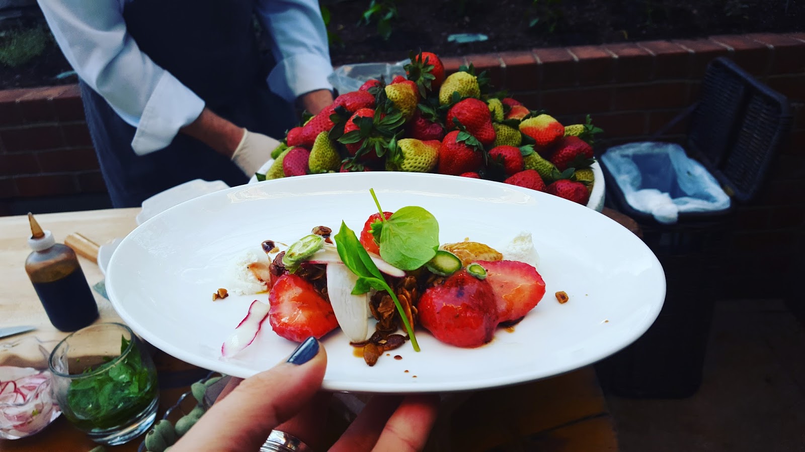 Out of the three cocktails in the photograph above, Strawberry Gin was my favorite. This pretty drink was the perfect way to start as strawberry themed dining experience. Strawberries go great with rhubarb, and this cocktail had both.